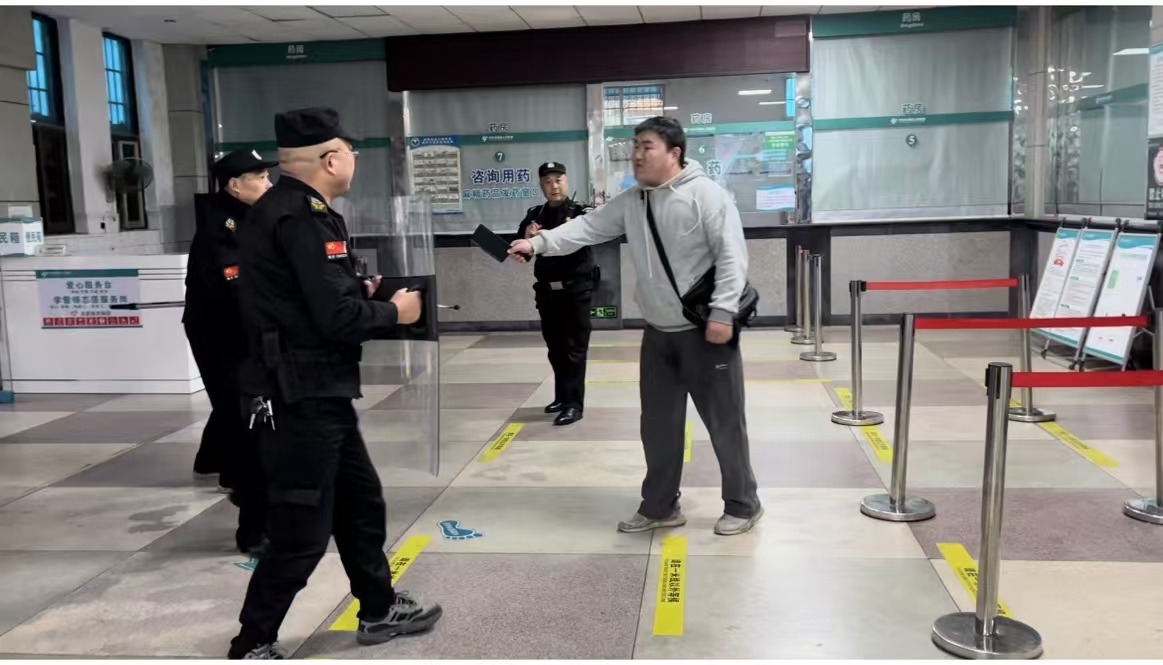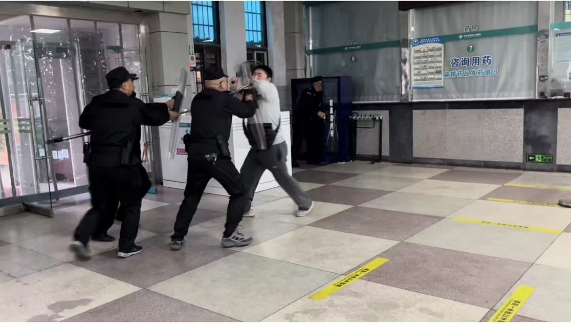 在確保自身安全的前提下,保安隊員使用防暴器材對歹徒進(jìn)行控制,并協(xié)助醫(yī)護(hù)人員將患者和家屬疏散至安全區(qū)域。