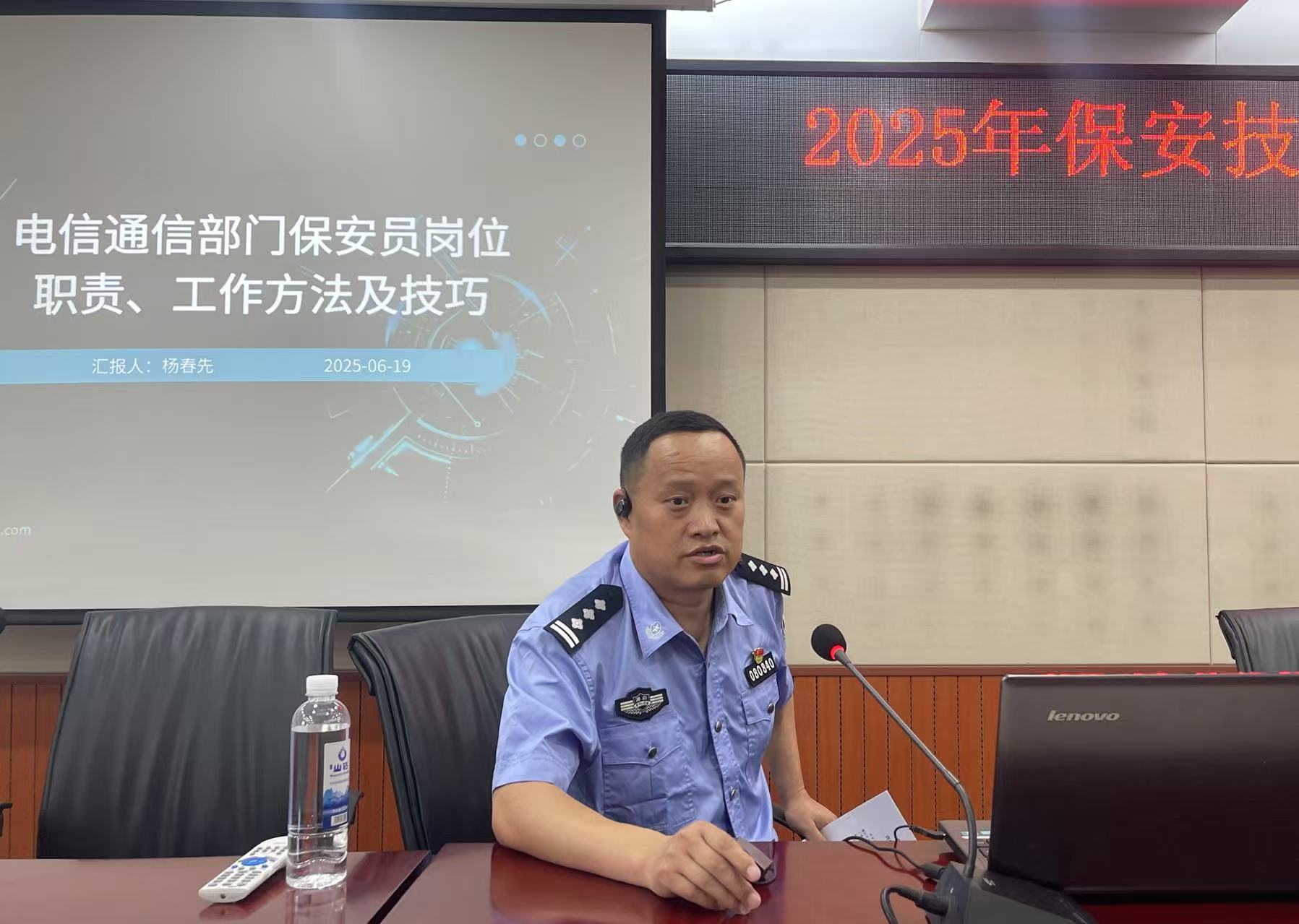 隨后,懷化市公安局鶴城分局治安大隊副大隊長楊春先為保安人員帶來了一場精彩的專題講座。講座圍繞 “通信部門保安員崗位職責、工作方法及技巧” 展開,楊副大隊長憑借豐富的實戰(zhàn)經(jīng)驗和專業(yè)知識,深入淺出地講解了通信部門安保工作的特點與重點。他從保安員的基本職責出發(fā),詳細闡述了日常巡邏、門禁管理、突發(fā)事件應對等工作的規(guī)范流程和實用技巧,并結(jié)合實際案例,生動地剖析了在工作中可能遇到的各種問題及解決方法。參訓人員認真聆聽,仔細記錄,紛紛表示受益匪淺。