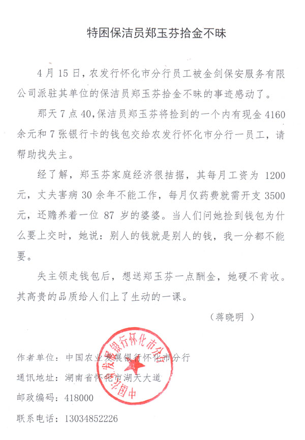 4月15日,中國農(nóng)業(yè)發(fā)展銀行懷化市分行員工被金劍保安服務(wù)有限責任公司派駐其單位的保潔員鄭玉芬拾金不昧的事跡感動了。